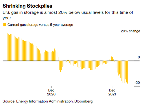 市場的火熱情緒來自激增的需求。目前,歐洲正在面臨一個異常寒冷的春天,這提振了供暖需求。隨著俄烏衝突期間歐洲試圖擺脫對俄羅斯天然氣(1.1, 0.00, 0.00%)的依賴,美國出口的天然氣激增,這使得美國的天然氣庫存比一般水平低了近20%,並推動了天然氣價格的上漲。