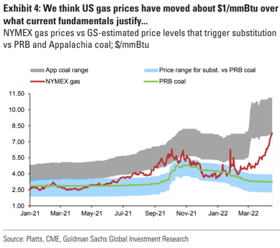 因此,高盛認為,合理的天然氣價格水平約為6.82美元/百萬英熱,任何超過8美元/百萬英熱的都被高估了。