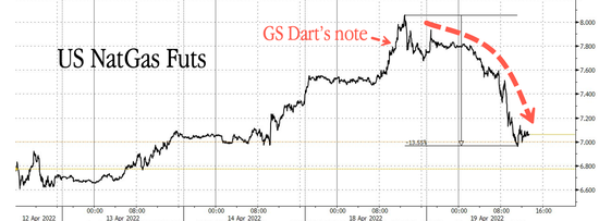 本週一美國天然氣價格飆升至13年高位,自2008年以來首次突破8美元。而就在價格見頂的2小時之前,高盛(341.06, 5.11, 1.52%)天然氣研究主管Samantha Dart對客戶表示,天然氣價格“可能過高”。
