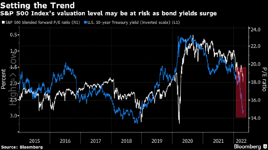 由於投資者對貨幣政策快速收緊及其對經濟增長的影響感到擔憂,並逃離風險資產,標普500指數指數已連續三週下跌,上週五跌至3月中旬以來的最低水平。美聯儲主席杰羅姆·鮑威爾為遏制通脹而支持採取激進政策行動,促使交易員預計美聯儲未來四次會議上將每次都加息50個基點。