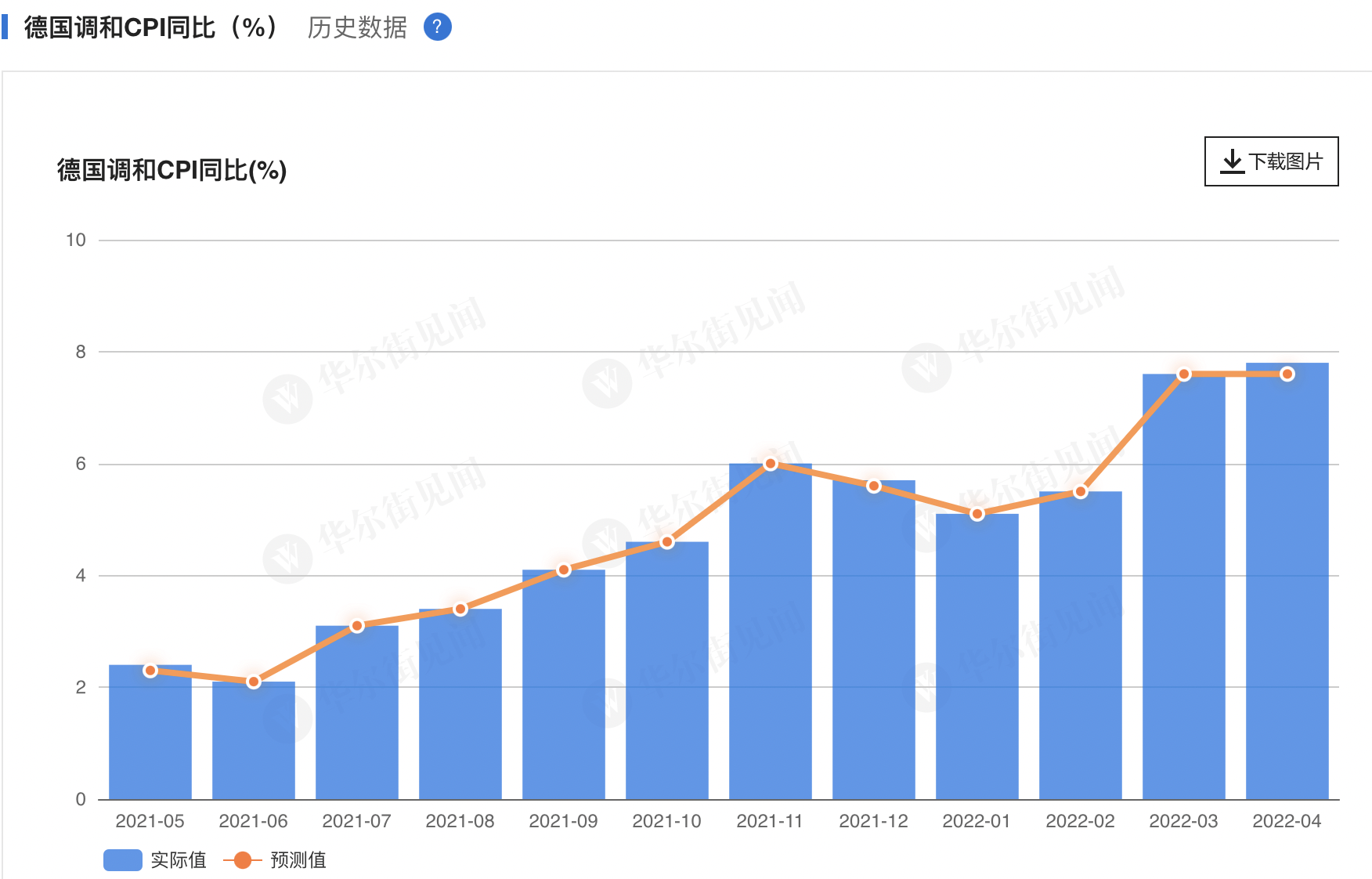 4月28日,德國聯邦統計局發布的最新數據顯示,德國4月調和CPI大漲7.8%,高於彭博社預期值7.6%,同時也高於前值。