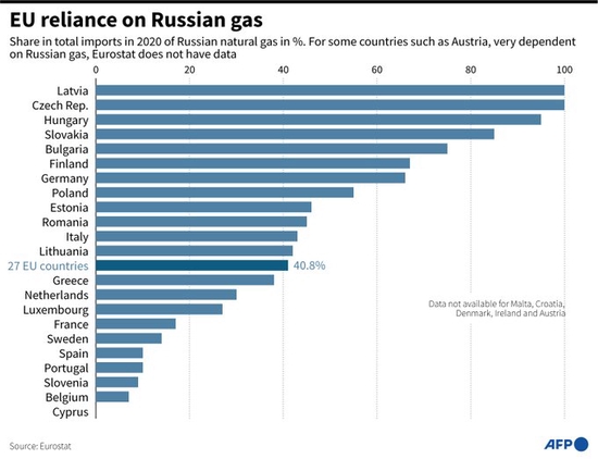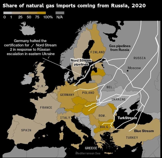 (俄氣佔2020年歐洲各國天然氣進口比重的份額)