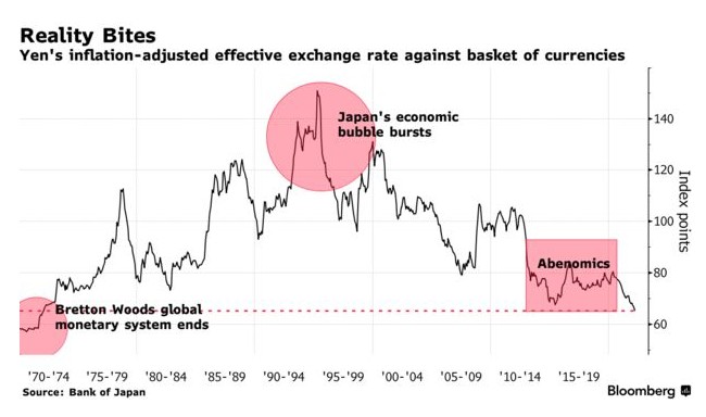 一項經通脹調整後的日元兌一籃子貨幣的強勢指標顯示,自上世紀90年代中期日本經濟泡沫破滅前後以來,日元大幅貶值。目前的匯率水平是半個世紀前的水平,當時美元與黃金的可兌換性結束,開啟了外匯市場的新時代。