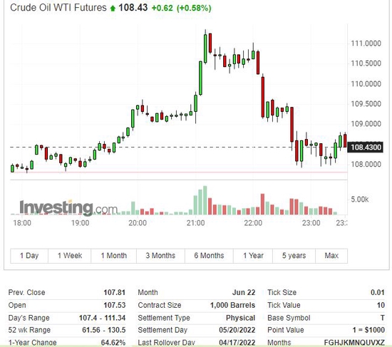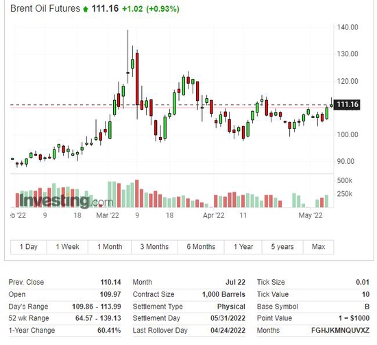 美油WTI 6月期貨在OPEC+堅持小幅增產、而非超量增產的新聞後,一度升至日高111.34美元,升破111美元整數位,日內最高上行3.53美元或漲3.3%。 國際布倫特7月期貨也一度升至日高113.99美元,上逼114美元,日內最高漲3.85美元或漲3.5%。