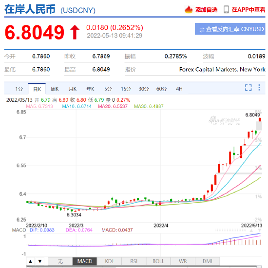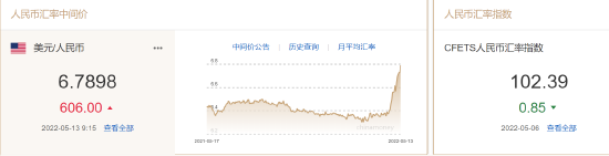5月13日,美元指數(104.4679-0.0320, -0.03%, )拉升逼近105關口,在岸人民幣(6.78900.0021, 0.03%, )跌破6.80,為2020年9月以來首次。 離岸人民幣跌破6.83。