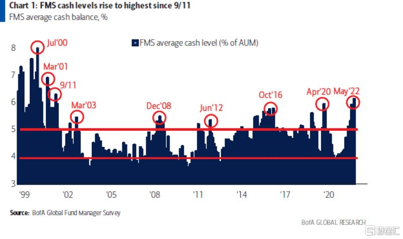 5月基金經理調查結果顯示,投資者對滯脹的擔憂加劇,正在囤積現金,現金餘額創2001年9.11事件以來的最高水準。