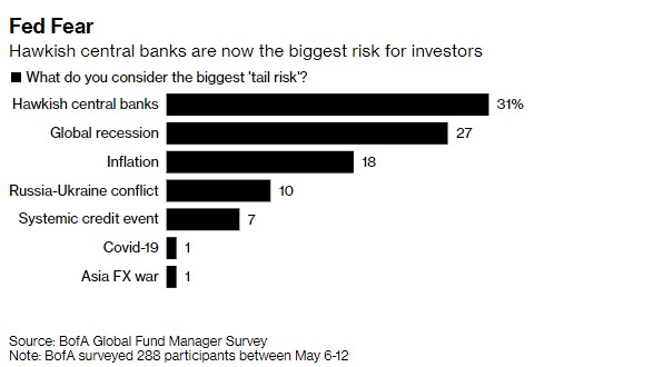 5月調查結果顯示,投資者現金水平觸及2001年9月以來最高,而對滯脹的擔憂則達到2008年以來最高水準,美國銀行將調查的結果描述為“相當悲觀”。 美國銀行對管理著8720億美元資產的機構投資者進行的最新調查還顯示,投資者認為各大央行集體“轉鷹”是最大尾部風險,緊接著是全球經濟陷入衰退。