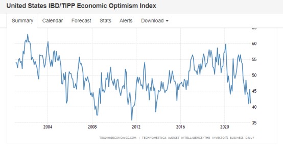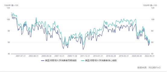 在美國持續高企的通脹率,以及美聯儲大幅加息普遍預期的重壓之下,美國消費者信心及預期早已受到打壓,反映在量化數據之中就是各大權威信心指數悉數下行。 比如,密歇根大學消費者信心指數以及密歇根大學消費者預期指數均處於近20年左右的相對較低水準,衡量市場對美國宏觀經濟樂觀與否的IBD/TIPP經濟樂觀指數處於近20年來的低位附近。