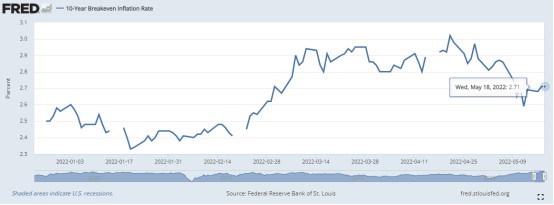 從反映債券交易市場對未來通脹預期的重要指標——10年期盈虧平衡通脹率近期數據來看(以每日為統計頻率,因此有空缺),在同比增幅低於歷史最高值的4月CPI公佈之後,該通脹預期有所下滑,然而,近日似乎又有了上升的勢頭。 結合近期債市及美股表現來看,背後反映的無疑是市場對美國通脹預期再度升溫,拉動美國GDP的主力——即消費“馬車”可能真的難以加速前進。