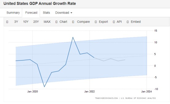 結合全球宏觀模型和分析師預期,金融數據統計與預測平臺Trading Economics預測數據顯示,到本季度末美國GDP增速約為2.1%,從長期來看,預計到2023年第一季度將達到2%,較2021年呈明顯放緩態勢,總體來看預測數據和高盛的預期沒有相差太遠。
