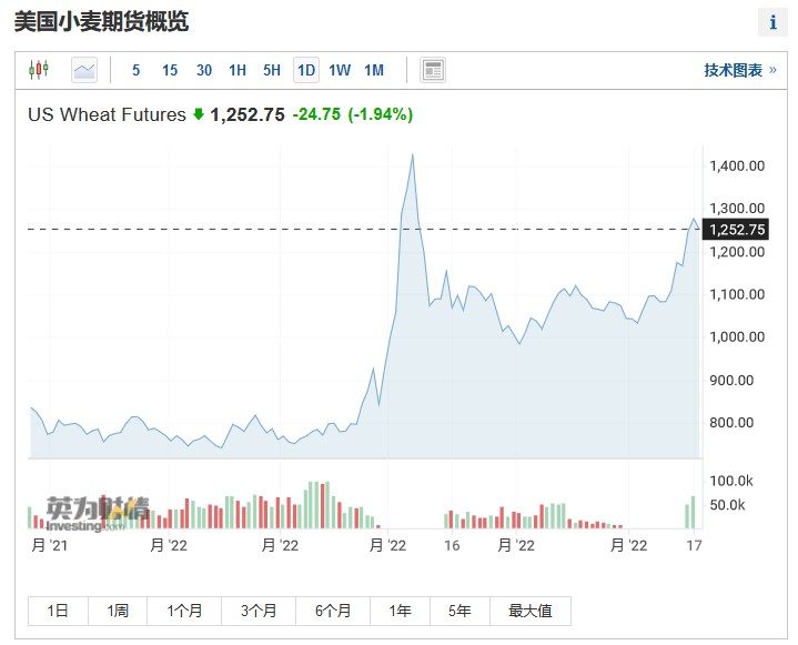 5月17日,印度政府宣佈部分放寬小麥出口的通知,允許向埃及出口一批小麥;此外,印度還將允許5月13日前登記的小麥貨物出口。 受此消息影響,芝加哥小麥期貨價格有所回落。 截至發稿,7月小麥期貨價格跌1.94%,報1252.75美分/蒲式耳。