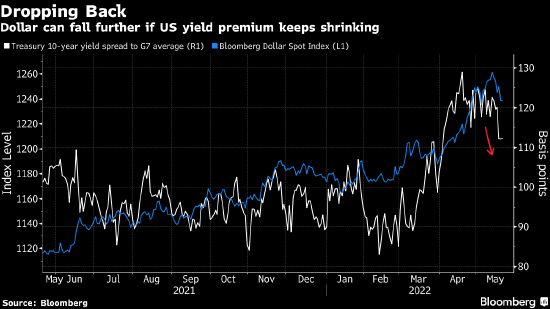 彭博彙編的數據顯示,10年期美國國債相對於其他G-7國家債券平均收益率的溢價已從4月19日的高點129個基點降至113個基點。