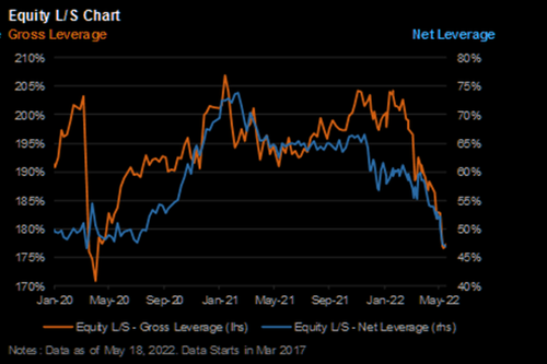 而再往前一周(5月9日至13日),衡量機構對股票敞口的指標——高盛的美國多空股票對沖基金客戶總槓桿率曾連降五日,是自2016年開始跟蹤該數據以來的最大降幅。 摩根士丹利(81.96-0.35, -0.43%, )的美國多空對沖基金客戶總槓桿率降至2020年4月以來最低,僅比2020年3月熊市時低點高出15%。