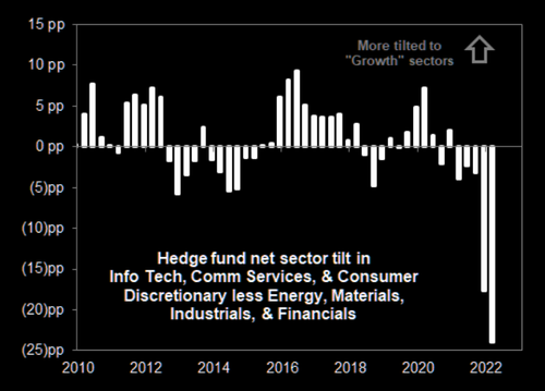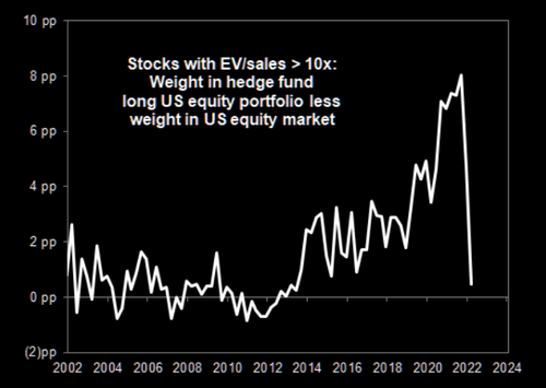 縱觀對沖基金的近期表現,它們持有非常高估值(例如企業價值與銷售額的倍數比例超過11倍)的股票數量急劇下降,並快速遠離成長股,去槓桿化幅度較為猛烈。