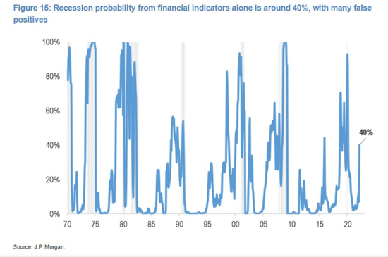 根據摩根大通(127.24, 0.88, 0.70%)追蹤標準普爾500指數、信用利差和收益率曲線的模型,就目前的情況而言,金融市場暗示衰退的可能性約為40%。 這幾乎是近期經濟指標所暗示概率的三倍。