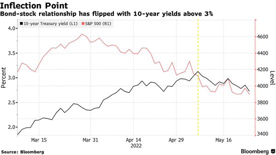 華爾街的一系列研究指出,當10年期美債收益率達到3%時,美股和美債的價格波動不再同頻,即美股繼續下跌,而美債價格開始反彈。 當憂心忡忡的投資者將風險資產套現,並在疲弱的經濟中尋求避風港時,股市下跌、債市堅挺的模式往往盛行。