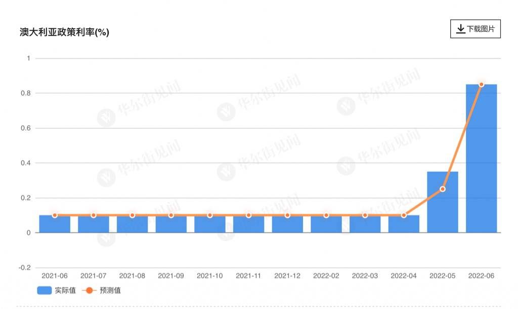 6月7日週二,澳洲聯儲宣佈加息50個基點,將基準利率從0.35%上調至0.85%,超出市場預期的25個基點。 接受彭博社調查的29位經濟學家中,只有3位預測了這一結果,其中大多數預測上調25個基點。