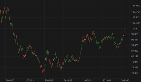 儘管美國的通脹率一直處於40年來的高位,但由於美聯儲激進“收水”,美國經濟逐漸從疫情中恢復,美元指數今年已達到2002年以來的最高水準。