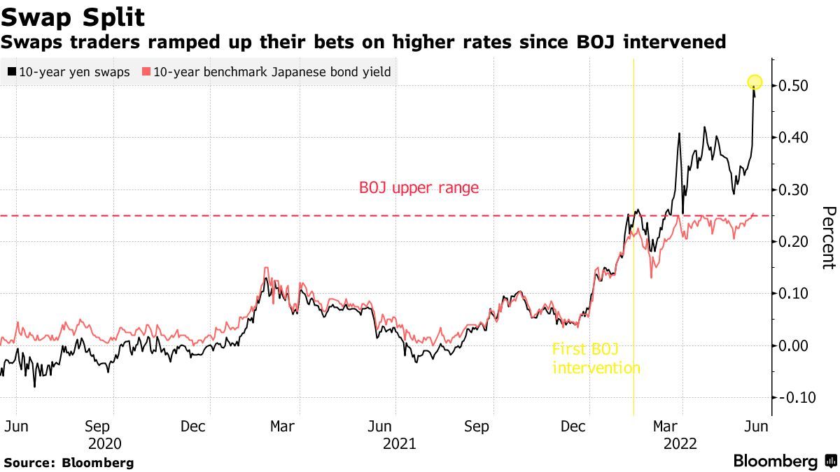 10年期日元掉期利率也大幅上升,打破了與日本國內收益率的密切聯繫。 數據顯示,前者已超0.50%,遠遠超過了日本央行設定的基準0.25%“底線”,這表明國際市場的交易員認為日債收益率上升和貨幣政策轉變不可避免。