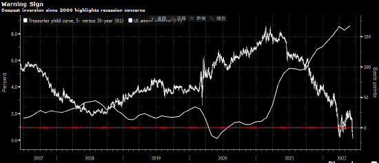 上週五美國公佈令人震驚的通脹數據,促使交易員加大對美聯儲政策收緊幅度的押注后,美國國債收益率曲線的關鍵部分已經倒掛。 兩年期國債收益率週一超過10年期國債收益率,這是自4月以來的首次倒掛; 五年期國債收益率一度高於30年期國債收益率逾17個基點,是20多年來差距最大的倒掛。