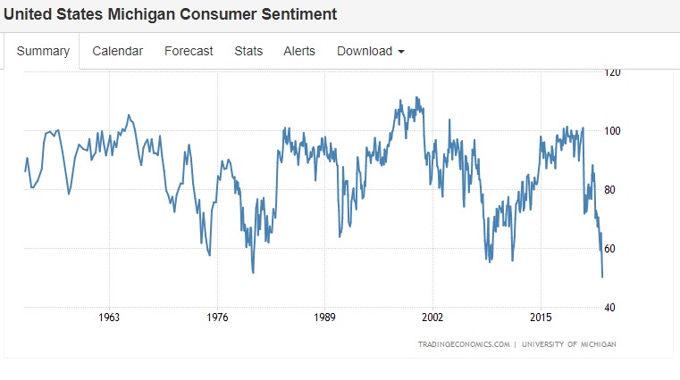 6月10日公佈的美國密歇根州的消費者信心指數顯示,該指數在6月急劇下降至50.2的創紀錄低點,遠低於市場預期58。 其中,46%消費者將他們的負面看法歸因於通貨膨脹,這是自 1981 年大蕭條以來的最大份額。