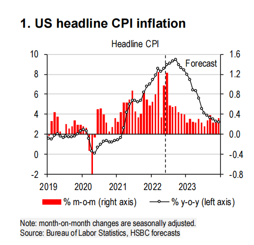 隨著食品、能源和核心CPI的全面上漲,美國5月整體CPI環比升1.0%,同比攀升至8.6%的高位。 滙豐預測,在未來幾個月,美國CPI將進一步上升,7月將超過9%,9月將達到9.4%的峰值。
