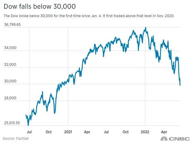 而繼此前納指和標普500指數先後入熊后,道指目前較歷史高位的跌幅也達到了逾19%,逼近技術性熊市區域。