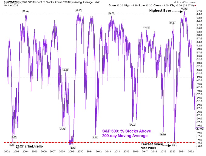 目前,標普500指數中只有13%的股票收盤高於200日移平均線,這一比例為自2020年4月以來的最低水準。