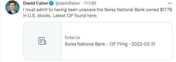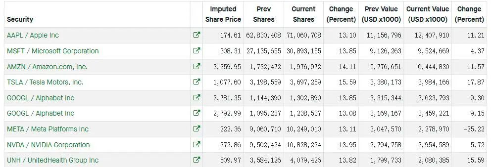 根據瑞士央行5月底發佈的13F檔,該央行一季度持有約1770億美元的美國股票,其中包含了大量的科技股,最大的持倉分別是蘋果(131.561.50, 1.15%, )、微軟 (247.652.68, 1.09%, )、亞馬遜(106.222.56, 2.47%, )、 特斯拉 (650.2810.98, 1.72%, )和谷歌(2157.3124.59, 1.15%, )母公司Alphabet。