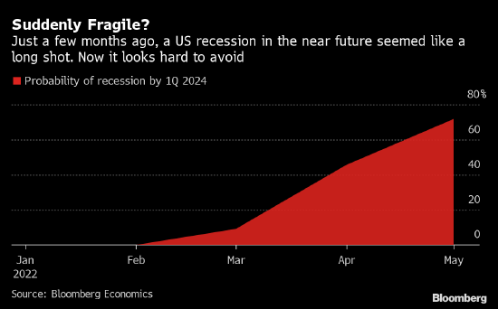 根據彭博經濟研究的最新預估,美國經濟到2024年初下滑的概率現在接近四分之三,而就在幾個月前,這甚至都毫無跡象。