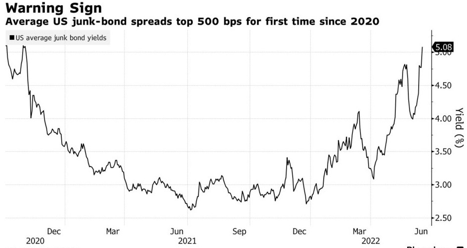 彭博美國企業高收益指數顯示,這一數據週四上升31個基點,至508個基點。 該數據衡量的是投資者為持有非美國國債所需要的額外收益率。 過去兩周,垃圾債券利差飆升100個基點,因美聯儲抑制通脹的努力加劇了市場對該央行將把美國經濟推入衰退的擔憂。