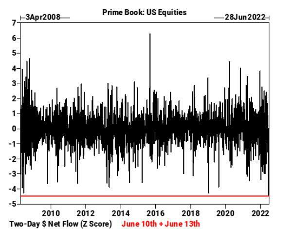 对冲基金不仅持续地抛售,抛售的规模也同样令人大跌眼镜。高盛称,在6月10日和13日的两个交易日内,对冲基金以创纪录的最快速度抛售了大规模的美股头寸。