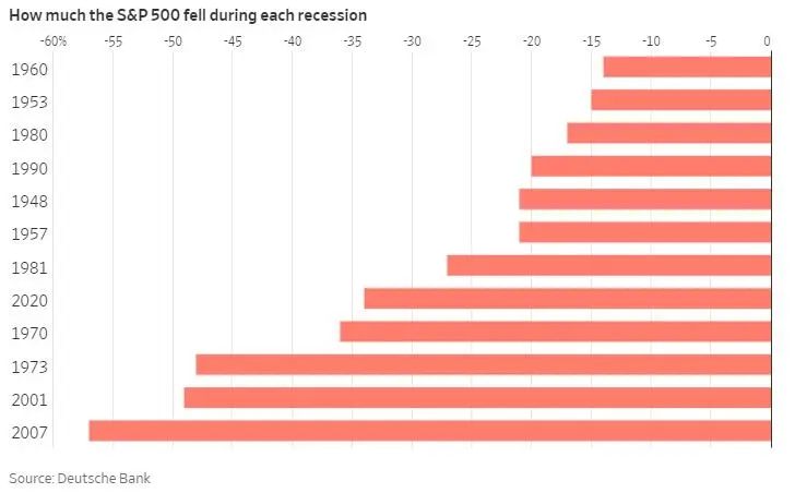 從歷史波動看,絲毫不出人意料的是,美國股市在經濟衰退期間通常表現不佳。 德意志銀行的研究顯示,自1946年以來,標普500指數在經濟衰退期間的跌幅中值為24%。 德意志銀行策略師Jim Reid在近期一份報告中曾寫道,“即使經濟未陷入衰退,我們也將接近邊緣區域。 ”