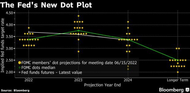 美聯儲上周公佈的點陣圖顯示,美聯儲官員預計利率將進一步上升,到年底前將升至3.4%,比3月的預估高150基點,這意味著今年還需再加息175基點。 此外,美聯儲官員預計,利率到2023年底將達到3.8%,比3月的預估高100基點。