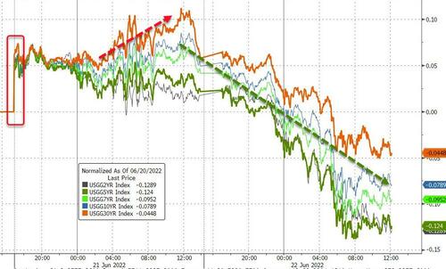 利率市场上的这些押注变化,在美债收益率隔夜的走势中也体现的淋漓尽致。鹰派的鲍威尔证词并未如往常那样提振各期限美债收益率攀升,与利率变动关联最为紧密的短债收益率反而领跌,对经济衰退的担忧促使投资者涌入相对安全的美债市场避险。