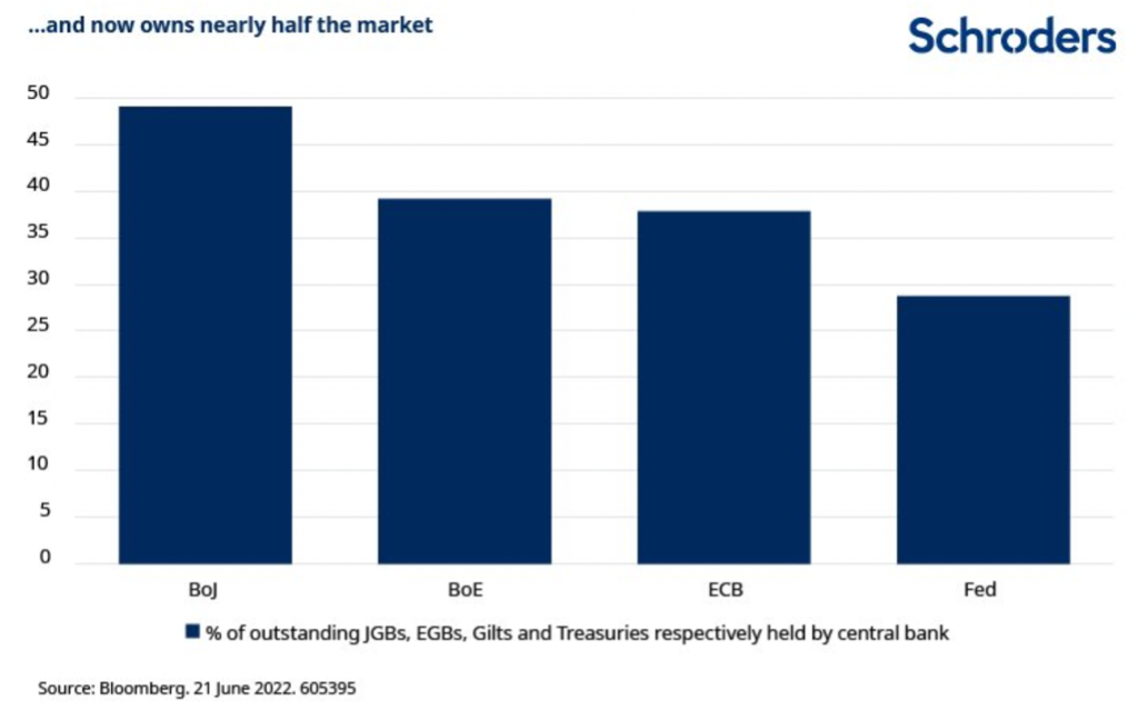 近期,為了維持收益率曲線控制(YCC)政策,日本央行大幅增持國債,僅上周就購買了了令人難以置信的11萬億日元,目前幾乎擁有日本國債市場的一半債券。