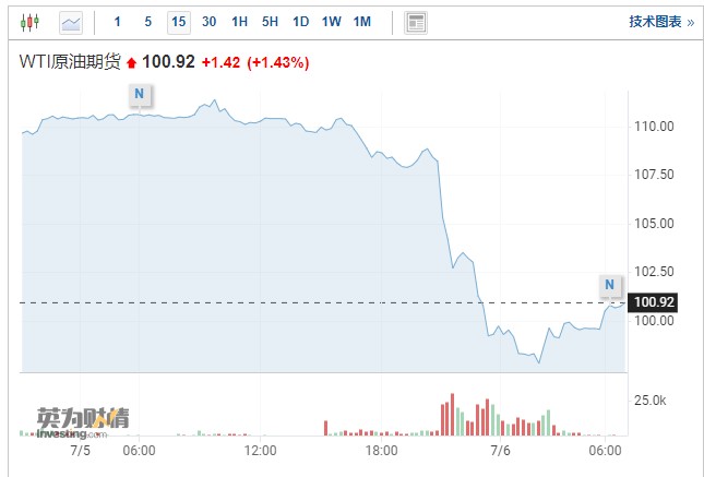 當地時間7月5日,美國WTI原油近兩個月首次跌破100美元/桶,收於99.50美元/桶,大跌8.2%; 布倫特原油收於102.77美元/桶,重挫9.5%。 這兩個基準指數均錄得3月9日以來的最大單日跌幅,並帶動汽油等大宗商品和油氣股走低,其中美國汽油期貨暴跌9.7%。 油價暴跌反映投資者越來越擔心全球經濟將出現衰退。