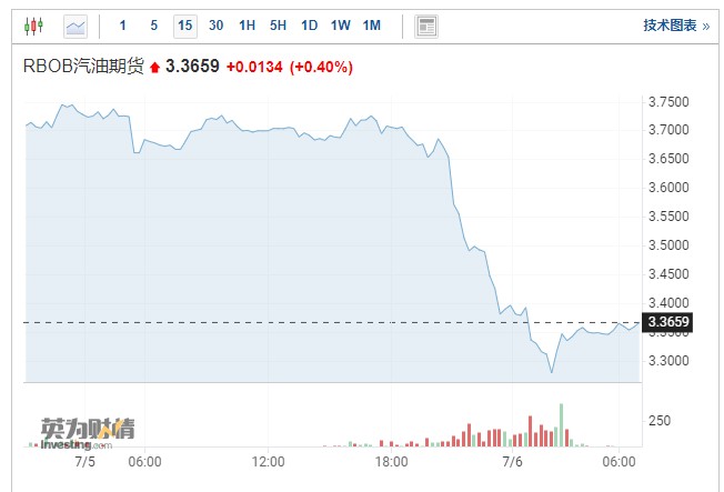 汽油跟隨原油出現暴跌,當地時間7月5日,美國RBOB汽油期貨結算價下跌9.7%,至每加侖3.329美元,創下16周來最大單日跌幅。