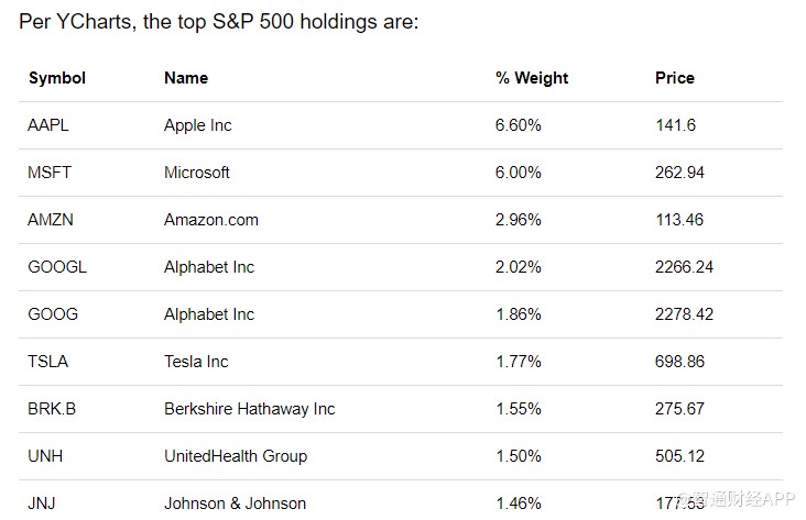 根據 YCharts,標普 500 指數的主要成分股包括: