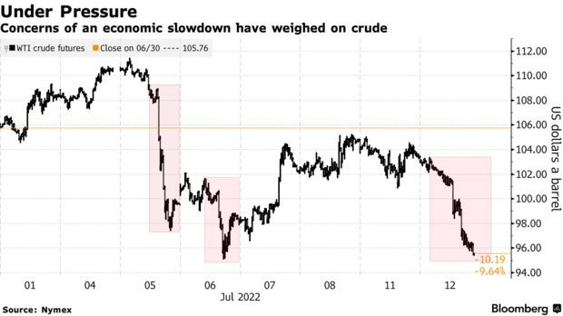 由於對全球經濟增長放緩和疫情反彈的擔憂降低了交易員的風險偏好,油價週二下跌。 數據顯示,WTI 8月原油期貨收跌7.92%,報95.84美元/桶; 布倫特9月原油期貨收跌7.10%,報99.49美元/桶。 其中,WTI原油期貨日內最深跌8.4%,自4月初以來首次跌至96美元下方; 布倫特原油期貨則失守100美元關鍵水準,同樣創下3個月來新低。