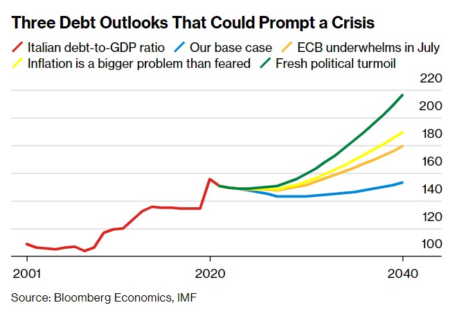 而如果歐洲央行需要在加息方面更加激進,義大利的借貸成本可能會變得更加難以維持。 這也形成了彭博經濟預期的第二個場景。 彭博經濟警告稱,即使將利率提高到3%,也可能將義大利的債務推上“爆炸的道路”。