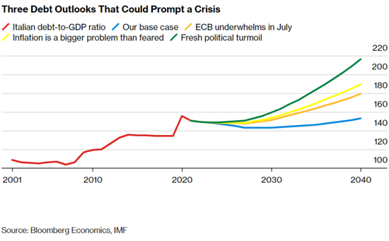 假如歐洲央行真的更加激進提高利率,那麼義大利的融資成本將變得更難維持。 彭博經濟研究院警告說,哪怕利率只是提高到3%,也可能會將義大利巨額主權債務推向爆雷的境地。