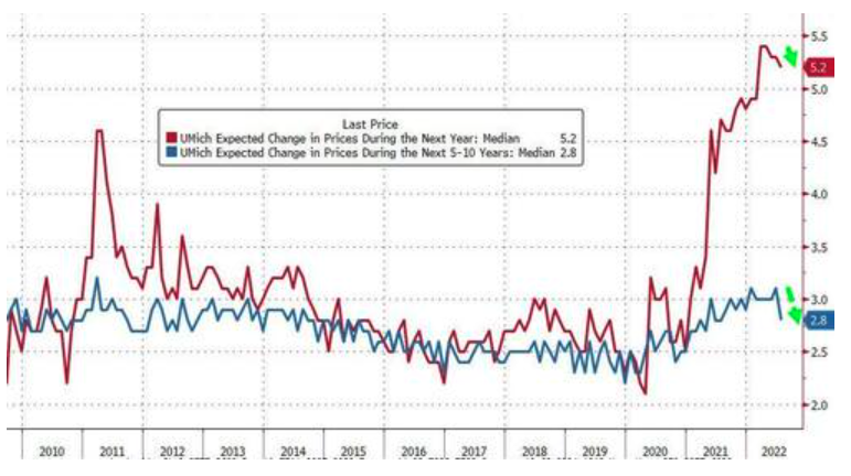 過去約一年的時間里,密歇根5年通脹預期處在2.9%-3.1%的窄幅波動區間,而6月初值一度打破該區間,達到3.3%,創下2008年以來的最高,令市場頗為關注,認為是長期通脹預期鬆動的表現,最新5年期通脹預期大幅下跌至2.8%,令通脹預期可能失控的擔憂大幅緩解。