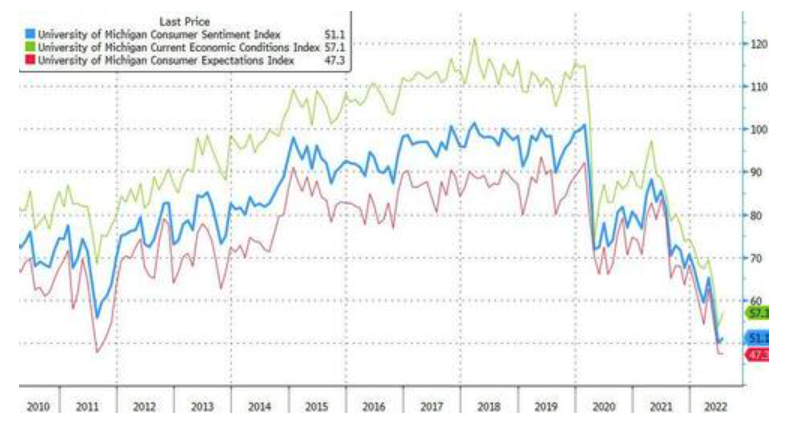 週五公佈的數據顯示,美國7月密歇根大學消費者信心指數初值51.1,高於預期的50,6月終值為50。 分項指數方面,現況指數初值57.1,創2021年4月來最大單月漲幅,預期53.7,前值53.8;預期指數初值47.3,較上月小幅回落,預期47,前值47.5。