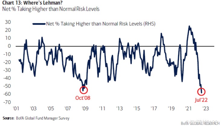 調查顯示,投資者對股票的配置跌至2008年10月以來的最低水準,而對現金的配置則飆升至2001年以來的最高水準。 淨58%的基金經理表示,他們承擔的風險低於正常水準,這一比例超過了在全球金融危機期間的水準。