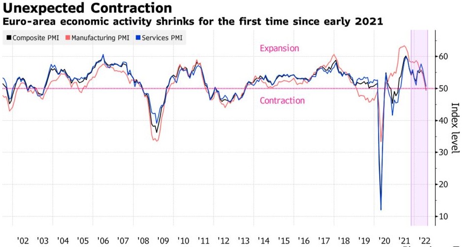 自2021年初疫情封鎖以來,歐元區經濟活動首次意外收縮,進一步表明衰退可能即將到來。 歐元區7月Markit綜合PMI初值為49.4,預期51,前值52。 歐元區7月Markit製造業PMI初值為49.6,預期51,前值52.1。 歐洲綜合PMI降至17個月來的最低點,低於榮枯線水準。 製造業產出惡化和服務業增長近乎停滯是造成此次衰退的主要原因。 經濟學家曾預計經濟會溫和增長。