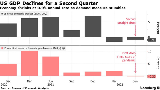 上周,為了抗擊40年來最熱的通脹,美聯儲宣布連續第二個月加息75個基點。 此後數據顯示美國國內生產總值連續第二個季度收縮,達到了一些經濟學家用作判斷經濟衰退的門檻。