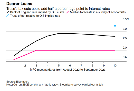 加息和資產出售的組合標誌著英國央行過去十年寬鬆貨幣政策發生了巨大轉變,借貸成本即將恢復到正常水準。 投資者預期關鍵利率到2023年初將達到近3%,而經濟學家則持謹慎態度。 但兩者都認為,如果特拉斯成為首相並兌現其價值300億英鎊的減稅計劃,利率可能會進一步升高。