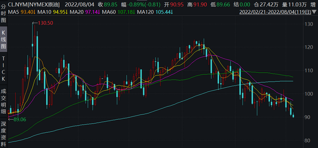 衰退交易下,空頭開始主導大宗商品市場,截至8月4日晚間,WTI原油自俄烏衝突以來首次跌破每桶90美元,較年內130美元的高點已相去甚遠。
