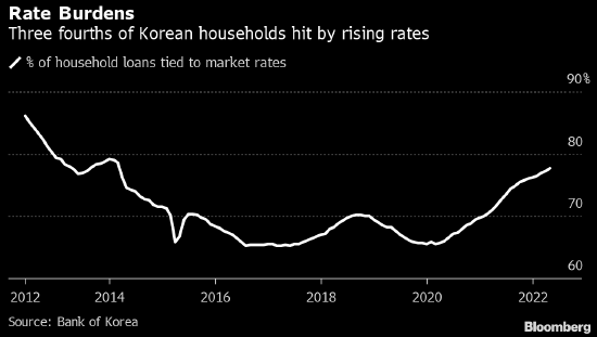 背負浮動利率貸款的家庭佔比達到2014年以來最高,這意味著相比2017-2018年的前一個緊縮週期,現在更多韓國人的還款額隨著央行升息而上升。